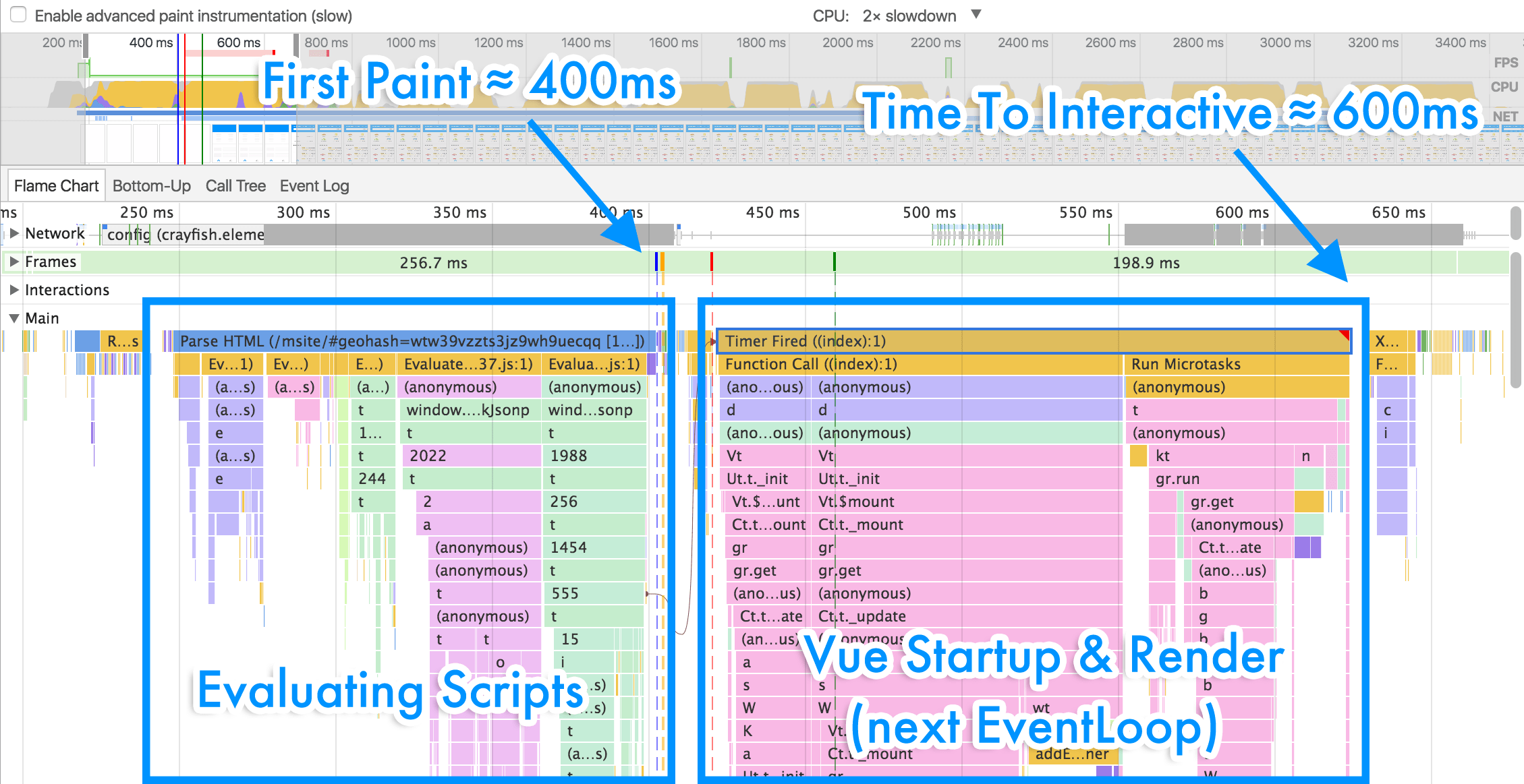 根据 Profile,我们发现在首次渲染(First Paint)发生之前,大量的时间(900 毫秒)都消耗在了 JavaScript 的运行上(Evaluate Script)。几乎所有脚本都是阻塞的(Parser-blocking),不过因为所有的 UI 都是由 JavaScript/Vue 驱动的,倒也不会有性能影响。这 900ms 中,约一半是消耗在包括 Vue 运行时、组件、库等依赖的运行上,而另一半则花在了业务组件实例化时 Vue 的启动与渲染上。从软件工程角度来说,我们需要这些抽象,所以这里并不是想责怪 JavaScript 或是 Vue 所带来的开销。