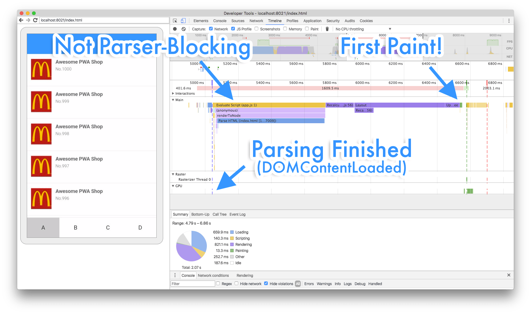Then I want to say: A script not blocking parser could still block painting nonetheless. So here is a reduced test I wrote named “Minimal Multi-page PWA”, or MMPWA, which basically render 1000 list items within an async